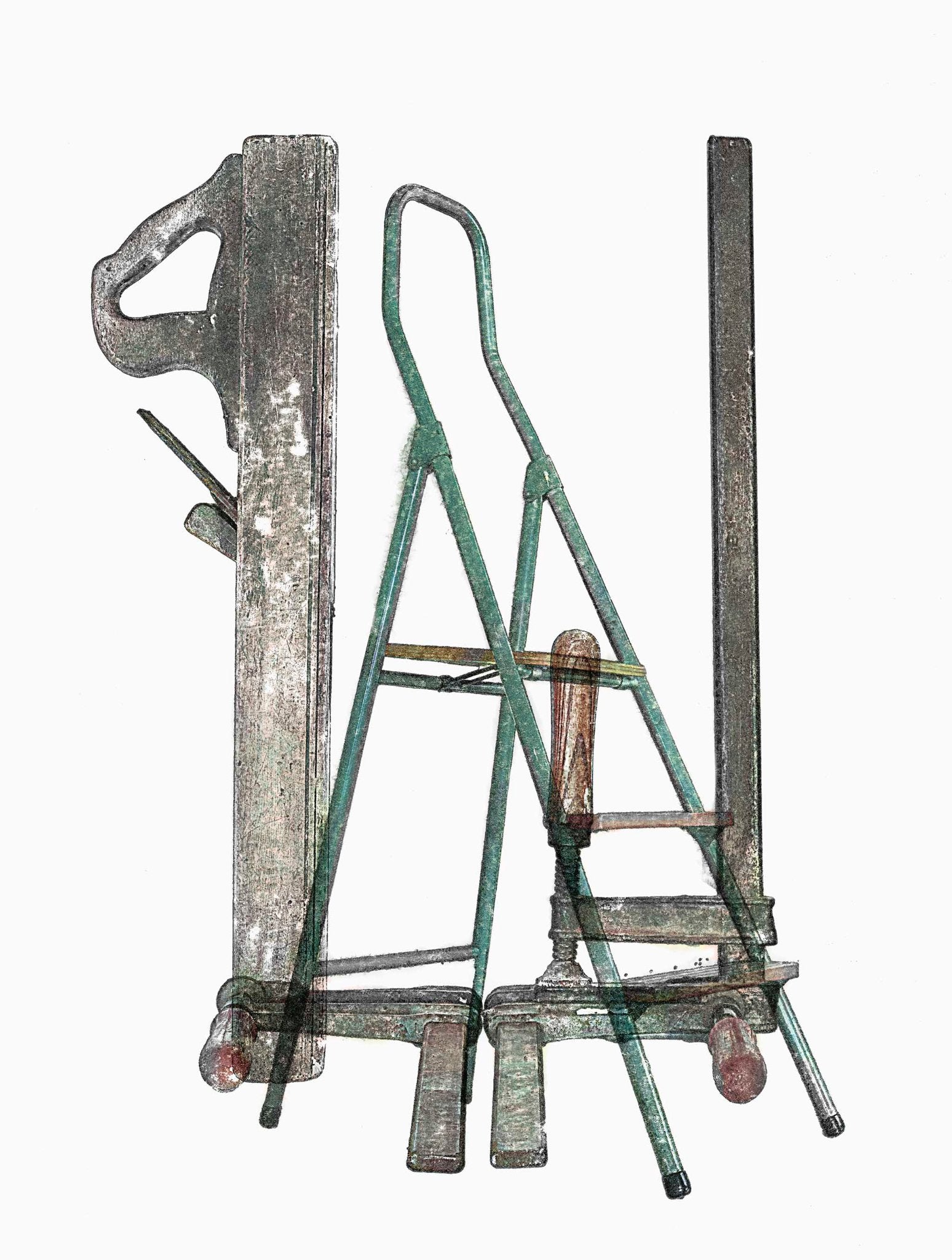 Laurent Isler transforms archival documentation into distinctive creations through a transfer process. For TRANSFERTS, he photographs nearly every object from the Trucothèque collection, a carefully archived library of machines and devices, mostly produced between 1970 and 2000, all salvaged from local recycling centers. Using xylene, he transfers the toner ink layer from simple laser prints onto virgin paper, creating layered collages that reveal possible temporal strata. These assemblages of sometimes absurd apparatus and machinery circulate in new forms, challenging conventional perspectives and celebrating resourcefulness through discarded materials.