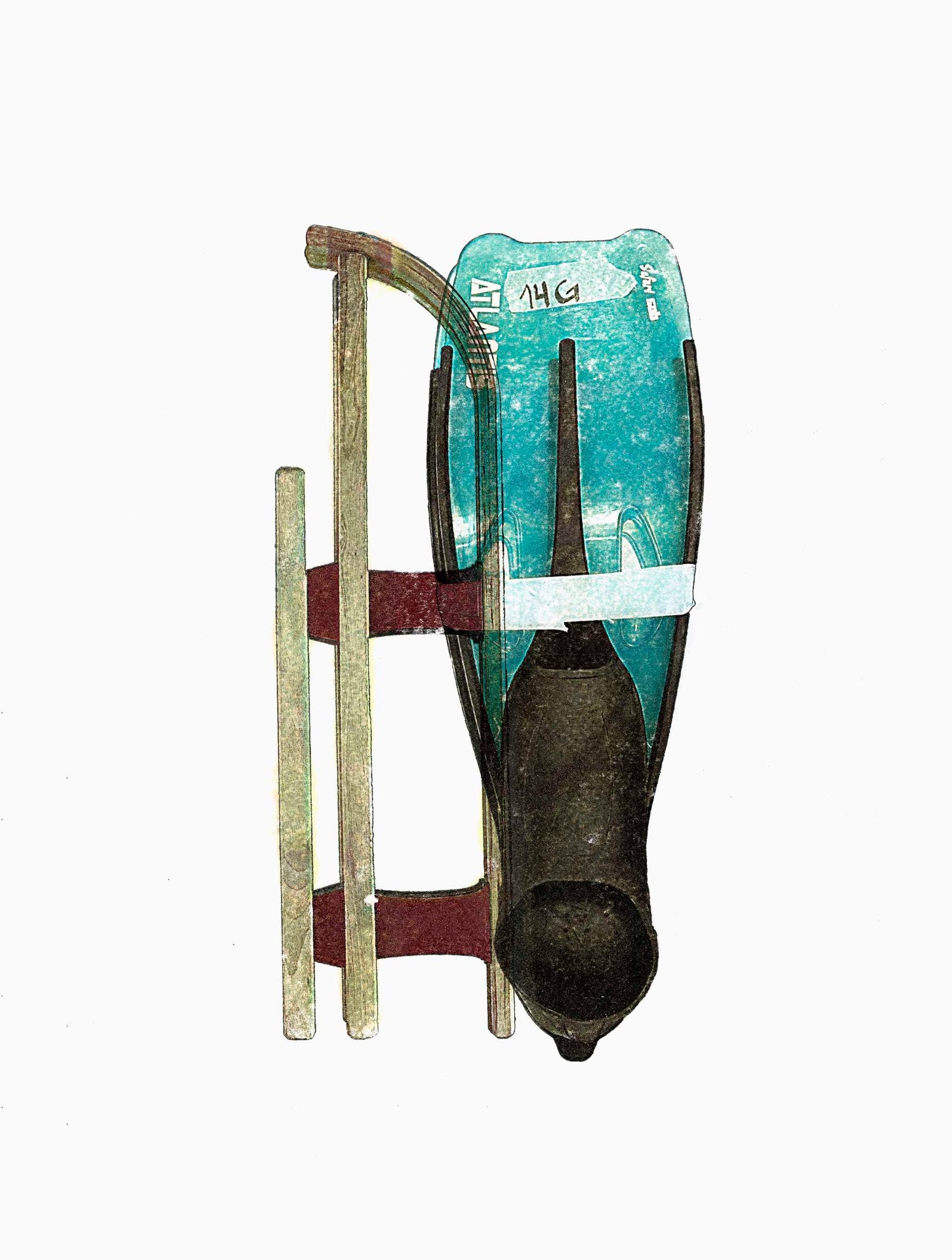 Laurent Isler transforms archival documentation into distinctive creations through a transfer process. For TRANSFERTS, he photographs nearly every object from the Trucothèque collection, a carefully archived library of machines and devices, mostly produced between 1970 and 2000, all salvaged from local recycling centers. Using xylene, he transfers the toner ink layer from simple laser prints onto virgin paper, creating layered collages that reveal possible temporal strata. These assemblages of sometimes absurd apparatus and machinery circulate in new forms, challenging conventional perspectives and celebrating resourcefulness through discarded materials.