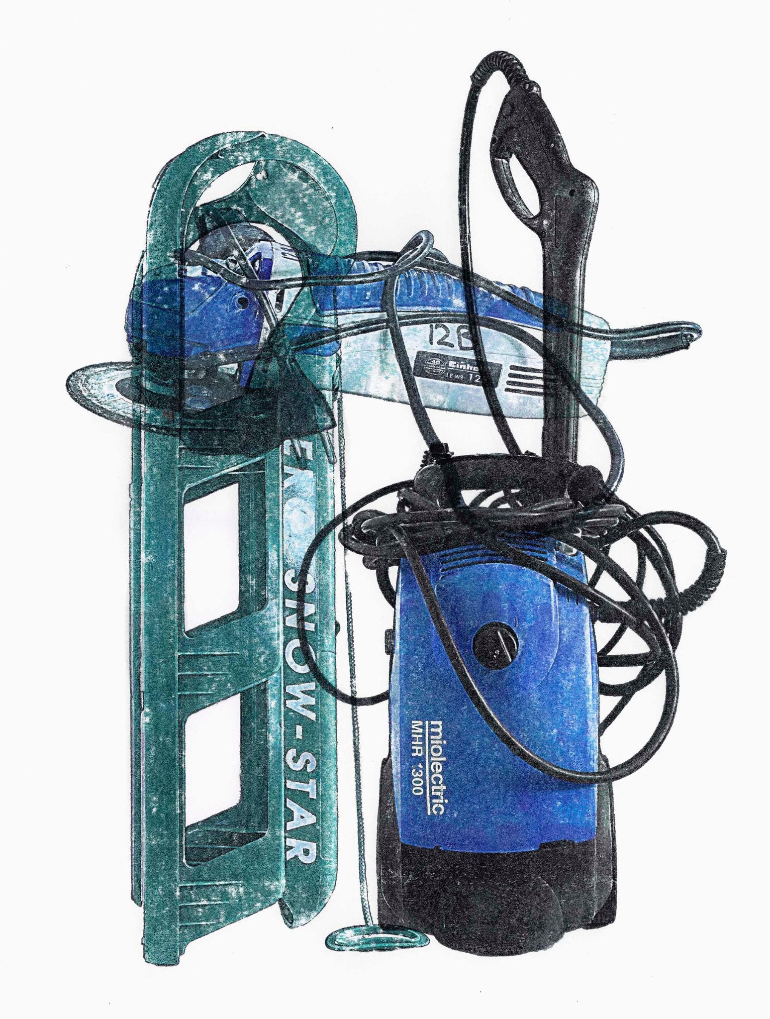 Laurent Isler transforms archival documentation into distinctive creations through a transfer process. For TRANSFERTS, he photographs nearly every object from the Trucothèque collection, a carefully archived library of machines and devices, mostly produced between 1970 and 2000, all salvaged from local recycling centers. Using xylene, he transfers the toner ink layer from simple laser prints onto virgin paper, creating layered collages that reveal possible temporal strata. These assemblages of sometimes absurd apparatus and machinery circulate in new forms, challenging conventional perspectives and celebrating resourcefulness through discarded materials.