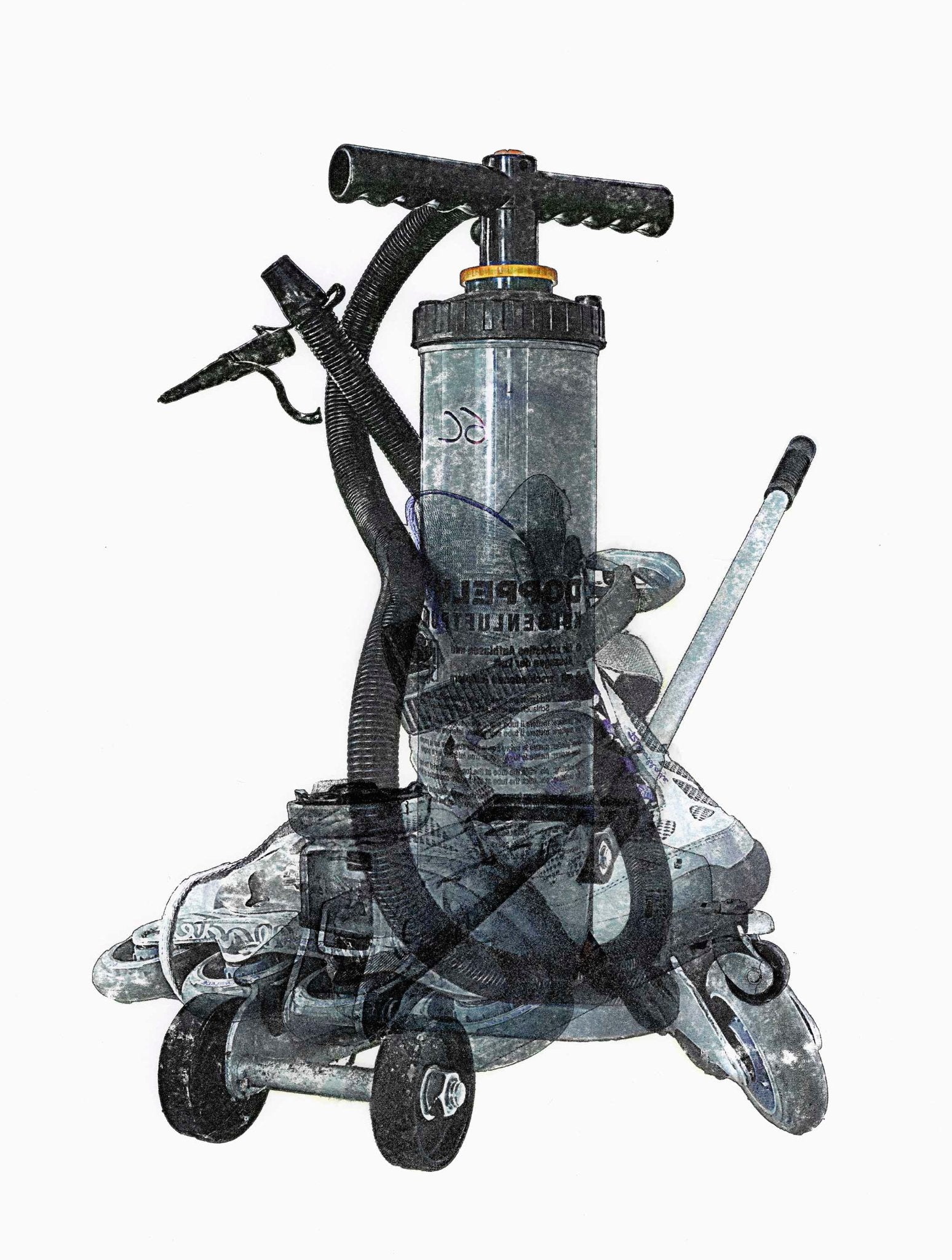 Laurent Isler transforms archival documentation into distinctive creations through a transfer process. For TRANSFERTS, he photographs nearly every object from the Trucothèque collection, a carefully archived library of machines and devices, mostly produced between 1970 and 2000, all salvaged from local recycling centers. Using xylene, he transfers the toner ink layer from simple laser prints onto virgin paper, creating layered collages that reveal possible temporal strata. These assemblages of sometimes absurd apparatus and machinery circulate in new forms, challenging conventional perspectives and celebrating resourcefulness through discarded materials.